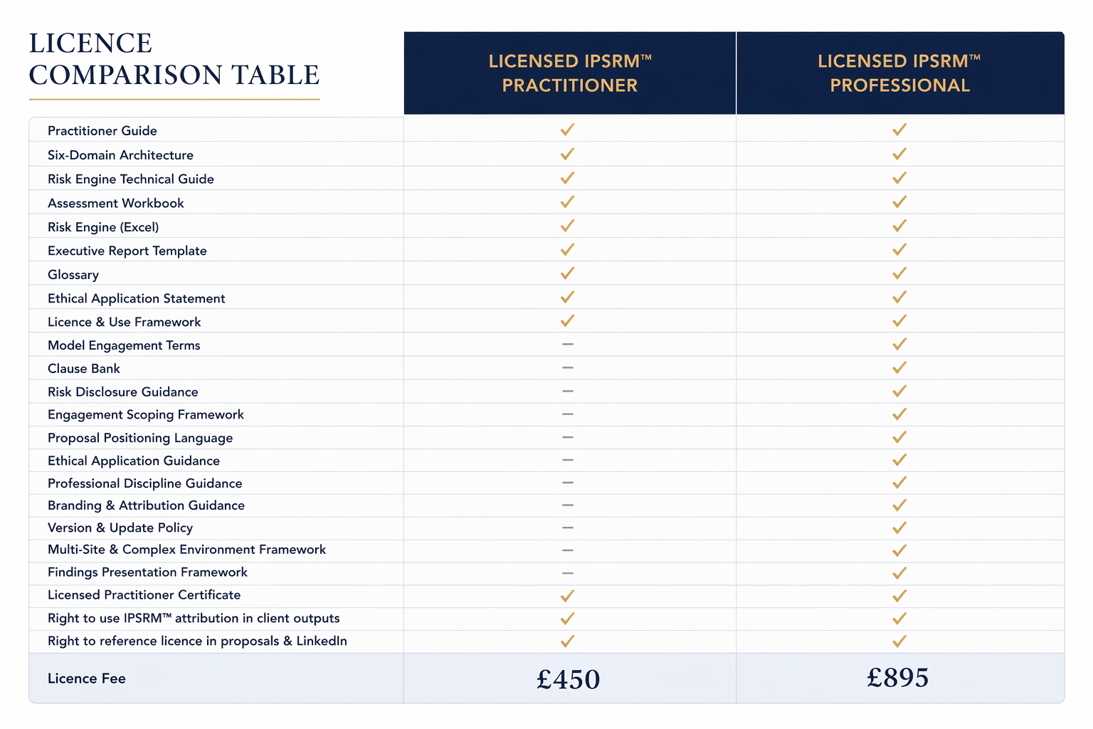 The IPSRM™ Practitioner Licence and Professional Licence are commercial intellectual property licences. They grant the holder the right to use the IPSRM™ Integrated Physical Security Review Methodology in their professional practice, to carry the Licensed IPSRM™ Practitioner status, and to attribute client-facing outputs to the methodology.