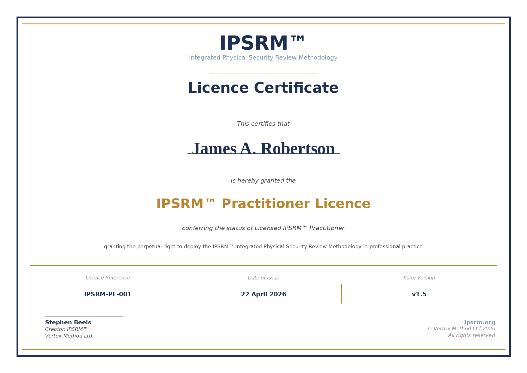 Every IPSRM™ licence includes a personalised IPSRM™ Licence Certificate issued by Stephen Beels, Vertex Method Ltd. It records your name, your licence tier, and the licence term. It is issued digitally on purchase and updated on renewal.